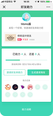 学员自发邀请好友点赞助力或砍价后低价购买,为课程裂变拉新,快速提升品牌曝光。