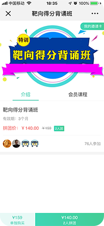 用户可自行发起拼团或邀请好友加入拼团,批量购买课程,提升销量。